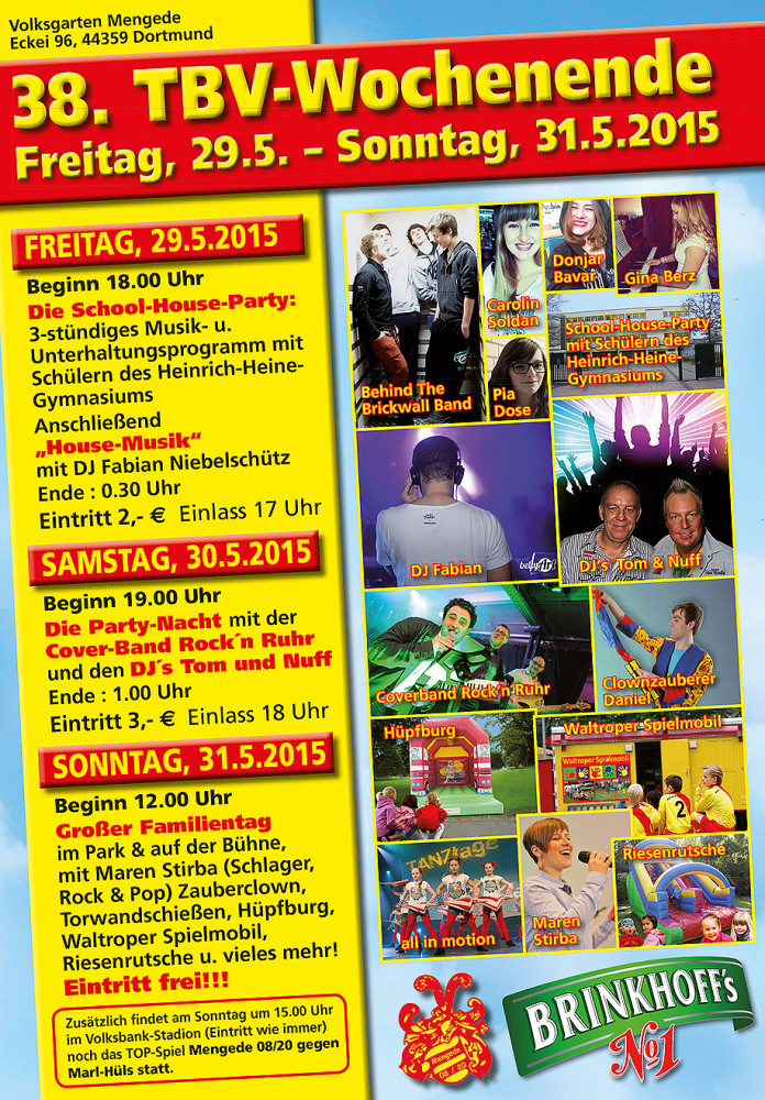 Vom 29. bis zum 31. Mai fand das inzwischen 38. TBV-Wochenende, das vom Verein Mengede 08/20 veranstaltet wird, im Volksgarten in Mengede statt. Im Rahmen diese Open-Air-Events wurde den Besuchern ein abwechslungsreiches Programm geboten. So stellten sich etwa kleinere Vereine der Öffentlichkeit vor und es bestand die Möglichkeit, sich über das Angebot von Mengede 08/20 zu informieren.