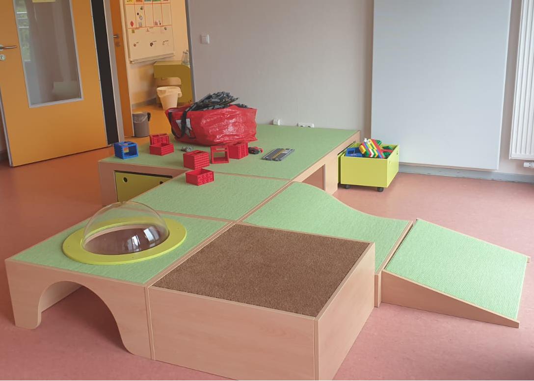 Ein weiteres Podest bietet zum einen Stauraum für Schubkästen mit Bausteinen und ermöglicht zum anderen das Spielen und Bauen auf verschiedenen Ebenen. Außerdem kann das Podest als Sitztribüne für die Zuschauer:innen bei Aufführungen dienen.