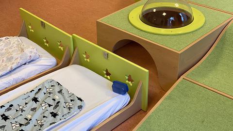 Da einige der Kinder nach dem Mittagessen ein kleine Schlafpause benötigen, wurden in diesem Raum Schlafplätze erschaffen: Unter einem flachen Podest verbergen sich Matratzen auf ausziehbaren Lattenrosten, die nach Bedarf hervorgeholt werden können. Nach dem Mittagsschlaf werden sie wieder unter das Podest geschoben und nehmen keinen Platz für andere Aktivitäten weg. So ist das Podest mit der neu errichteten Spiegelwand samt Ballettstange beispielsweise als „Tanzstudio“ und Theaterbühne nutzbar.