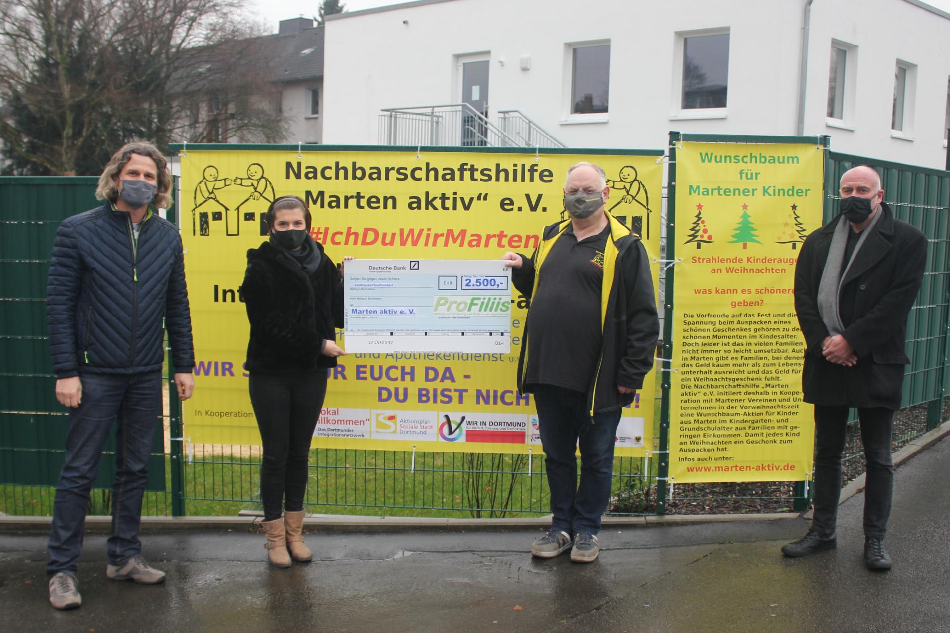 Um sicherzustellen, dass wirklich alle Wünsche erfüllt werden können, haben die Verantwortlichen von Marten aktiv bei ProFiliis finanzielle Förderung beantragt. Die Stiftung sagte Unterstützung in Höhe von bis zu 2.500,- Euro zu. Dank der Bereitschaft der Martener Bürger:innen Wünsche zu erfüllen, wurden letztlich tatsächlich nur rund 800,- Euro der zugesagten Fördersumme benötigt, um allen Kindern ihre Wünsche zu erfüllen. Von dieser überwältigenden Hilfsbereitschaft der Martener Bevölkerung waren sowohl die Macher:innen von Marten aktiv als auch das Team von ProFiliis positiv überrascht. Da der ursprünglich zugesagte Zuwendungsbetrag so nur zu einem Bruchteil in Anspruch genommen wurde, wurde dem Verein für ein zukünftiges Projekt eine bevorzugte Behandlung zugesagt.