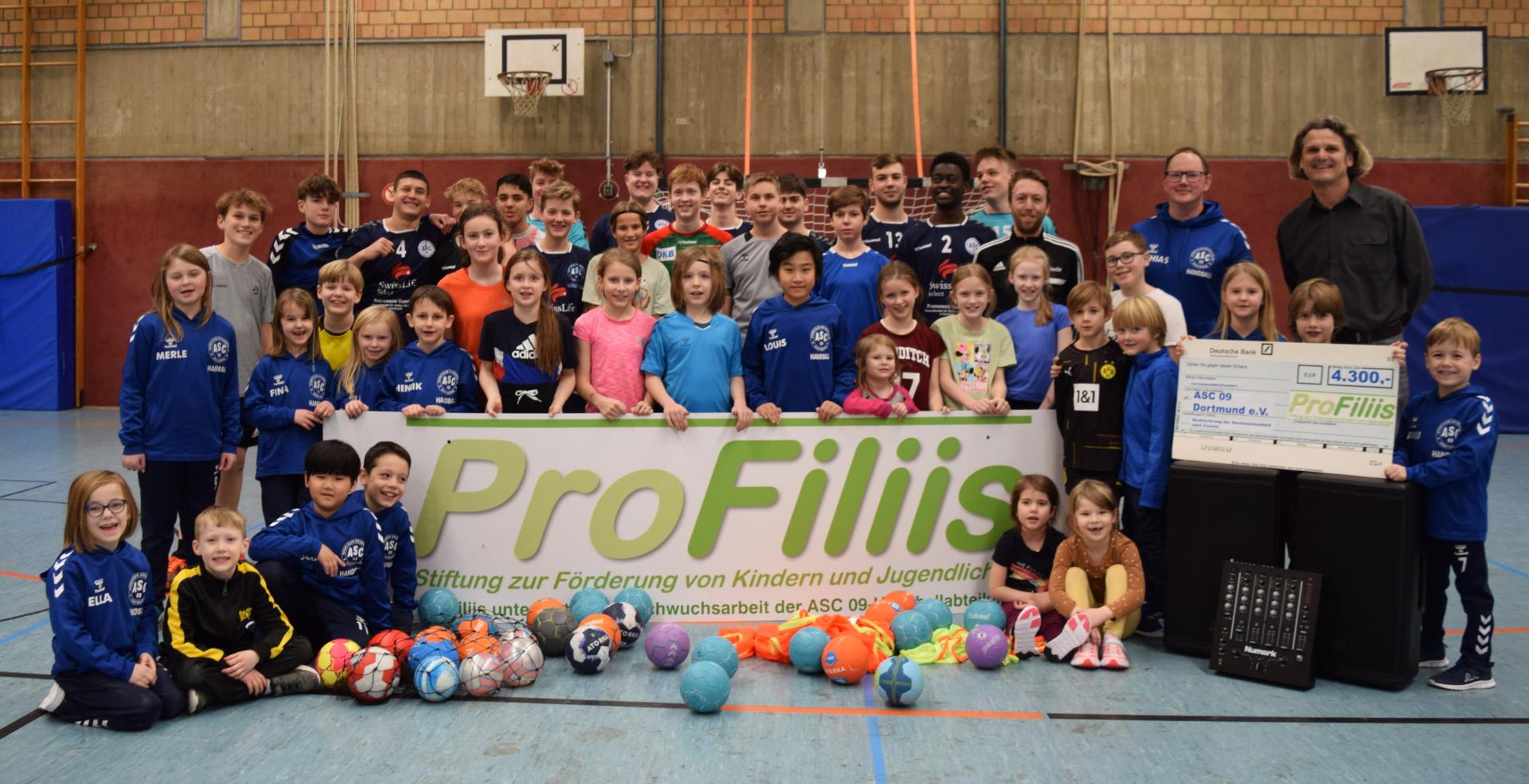 Mit den Lockerungen im Corona-Management kam der Wunsch, die Kinder- und Jugendarbeit wieder zu intensivieren. So wurden zusätzliche Trainings, neue Angebote an Schulen und Kindergärten sowie Feriencamps geplant. Um diese Erweiterungen realisieren zu können, waren einige Neuanschaffungen nötig, insbesondere da der ASC 09 in seinen Trainingsaktivitäten vor einer großen Herausforderung steht: „Unser Trainings- und Spielbetrieb ist auf mehrere Hallen in Dortmund verteilt. In keiner dieser Hallen haben wir die Möglichkeit, unser Equipment zu deponieren. Unsere Trainer haben das Geräte- und Materiallager daher im Kofferraum ihrer privaten Pkw. Das bedeutet natürlich, dass wir alle Materialien mehrfach anschaffen müssen“, erklärt Frank Fligge, Abteilungsleiter Handball beim ASC 09. Aus diesem Grund wendeten sich die Verantwortlichen an die ProFiliis-Stiftung, die gerne finanzielle Unterstützung zusagte und Mittel in Höhe von 4.300,- Euro bereitstellte. So konnten u. a. Lautsprecherboxen, Bälle, Leibchen, Airbodies und Vereinskleidung angeschafft werden. Zudem übernahm ProFiliis die Leihgebühr für eine Hüpfburg, sodass ein Nachwuchs-Schnuppertag besonders abwechslungsreich gestaltet werden konnte, und leistete einen Beitrag zur Ehrenamtspauschale für die Übungsleiter:innen.