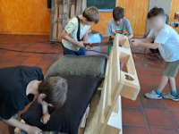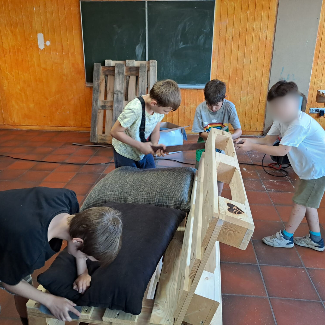 Bei den Überlegungen bezüglich einer neuen Ausstattung waren sich alle einig, dass diese vor allem belastbar und haltbar, aber auch flexibel einsetzbar sein sollte. Schließlich wurde die Entscheidung getroffen, selbst Palettenmöbel zu bauen, die den Anforderungen und Gegebenheiten im Smile entsprechen. Da Besucher:innen aller Altersgruppen ihre Hilfe bei diesem Vorhaben anboten, wurde für die Zeit nach den Sommerferien 2023 ein Möbelbau-Projekt geplant, bei dem gemeinschaftlich Palettensofas und Co. errichtet werden können.