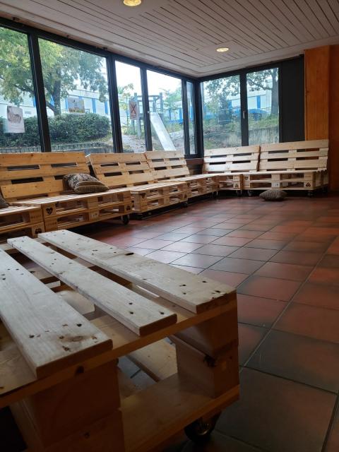 Konkret gibt es einen multifunktionalen Raum, der von den Kindern häufig als Bewegungs- und Spieleraum, von den Jugendlichen vorrangig als gemütlicher Aufenthaltsraum genutzt wird. Aktuell ist der Raum mit alten Sofas möbliert, die leider inzwischen kaum noch nutzbar sind. Bei den Überlegungen bezüglich einer neuen Ausstattung waren sich alle einig, dass diese vor allem belastbar und haltbar, aber auch flexibel einsetzbar sein sollte. Schließlich wurde die Entscheidung getroffen, selbst Palettenmöbel zu bauen, die den Anforderungen und Gegebenheiten im Smile entsprechen. Da Besucher:innen aller Altersgruppen ihre Hilfe bei diesem Vorhaben anboten, wurde für die Zeit nach den Sommerferien ein Möbelbau-Projekt geplant, bei dem gemeinschaftlich Palettensofas und Co. errichtet werden können.