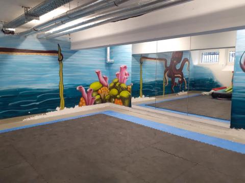 Das Team von GrünBau berichtet: „Ein großer Teil der Mittel ist für die Bewegungsförderung der Kinder und Jugendlichen verausgabt worden.“ Es wurde ein Aktivraum eingerichtet und mit Fitnessmatten ausgelegt. Nun kann hier sicher getobt werden und auch das beliebte Boxtraining stattfinden. Für die älteren Kinder wurde Boxequipment angeschafft: Standboxsack, Boxhandschuhe, Schlagpolster und Elastikbänder. Sie können auf diese Weise in einem kontrollierten Rahmen ihre Kräfte messen, Wut rauslassen und Spannungen abbauen. Den Kleineren wurden sogenannte Wutkeulen und Schaumstoffbausteine zur Verfügung gestellt. Außerdem wurde mit einem Klettergerüst ein Kletterdschungel installiert. Auch für Tanzproben ist der Raum ideal, da an einer Wand bruchsichere Spiegel aufgehängt wurden und so eine große Spiegelfläche entstanden ist. Auch Billardtisch und Dartscheibe sind im Aktivraum vorhanden. Hierfür wurde neues Equipment angeschafft: Neue Queues und Dartpfeile.