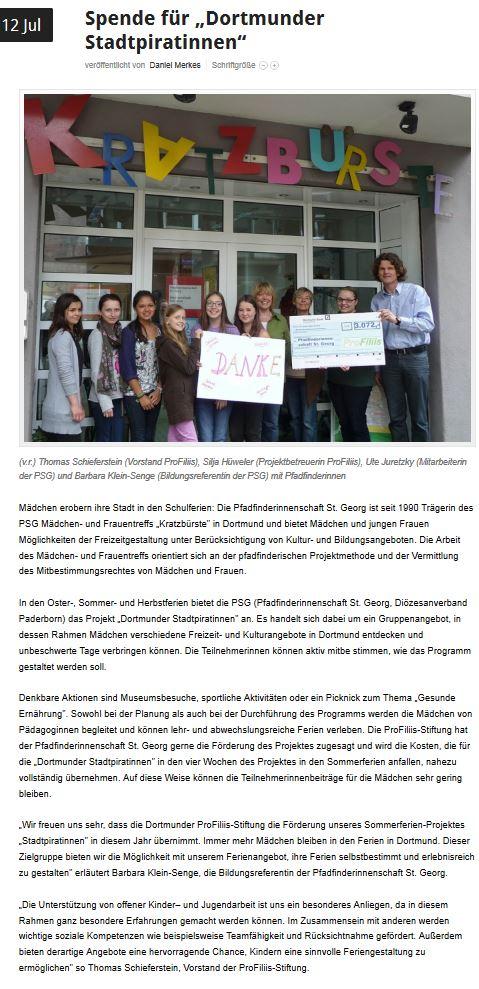 In den Oster-, Sommer- und Herbstferien bietet die Pfadfinderinnenschaft St. Georg das Projekt „Dortmunder Stadtpiratinnen“ an. Es handelt sich dabei um ein Gruppenangebot, in dessen Rahmen Mädchen zusammen mit anderen verschiedene Freizeit- und Kulturangebote in Dortmund entdecken und sich von ihrem Alltag erholen können. Die Teilnehmerinnen können aktiv mitbestimmen, wie das Programm gestaltet werden soll. Die ProFiliis-Stiftung hatte der Pfadfinderinnenschaft St. Georg die Übernahme der Kosten für die vier Wochen des Projektes in den Sommerferien zugesagt. Auf diese Weise konnten die Teilnehmerbeträge für die Mädchen sehr gering bleiben.
