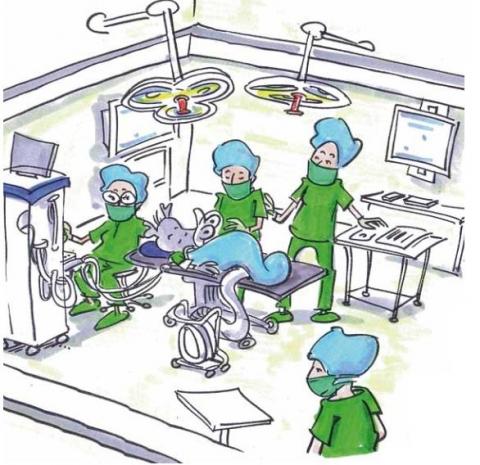 Nun wurde ein zweites Büchlein entworfen und produziert, in dem Alex operiert werden muss. Auf diese Weise erfahren die Kinder alles für sie Interessante rund um das Thema Anästhesie und Operation. Insbesondere lernen sie den Ablauf einer Operation kennen bzw. das, was vorher und nachher passiert, und haben dann hoffentlich etwas weniger Angst, wenn sie selbst operiert werden müssen.