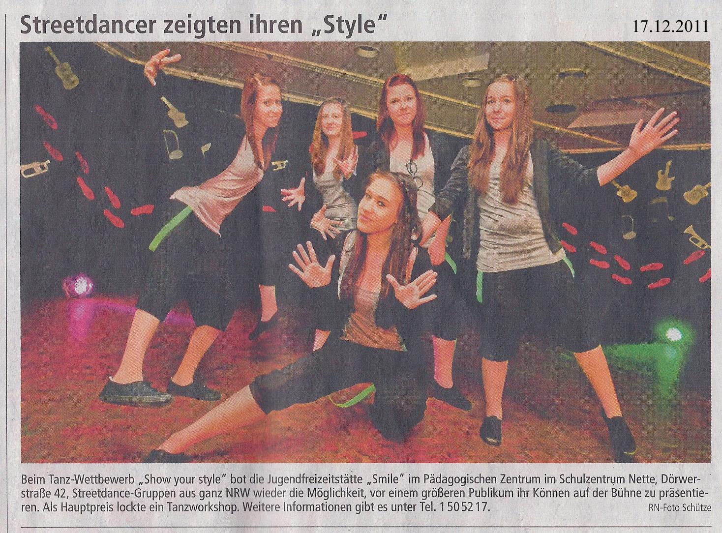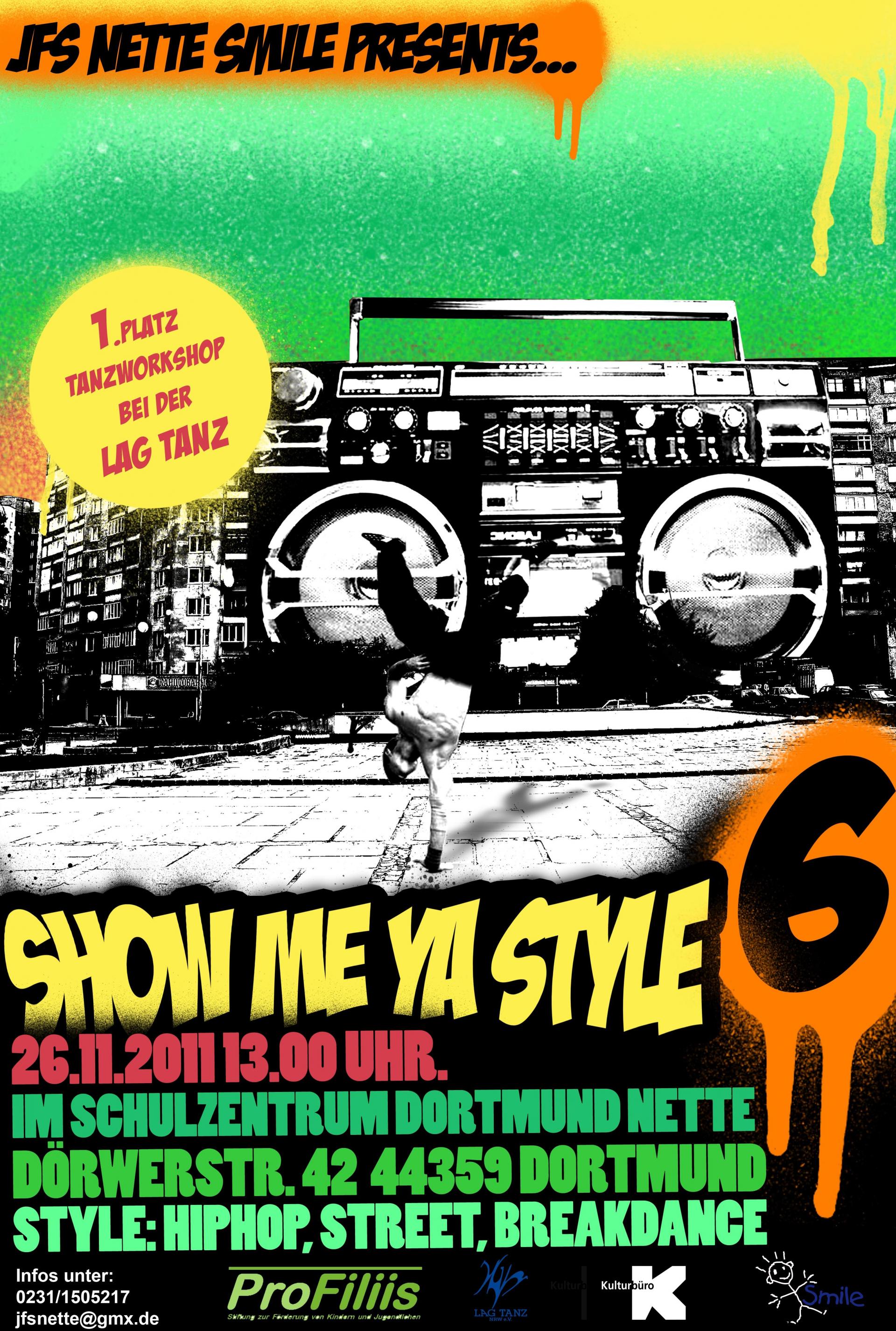 Auch in diesem Jahr soll der Dance Contest "Show Your Style" wieder in der Netter Jugendfreizeitstätte Smile durchgeführt werden. Der Contest wird als Jugendkulturevent für Streetdance-Gruppen aus ganz NRW durchgeführt. In der Vergangenheit nahmen pro Jahr zwischen 10 und 12 Tanzgruppen mit insgesamt 70 Tänzer:innen an dem Event teil, der durchschnittlich 200 Besucher:innen anlockte.