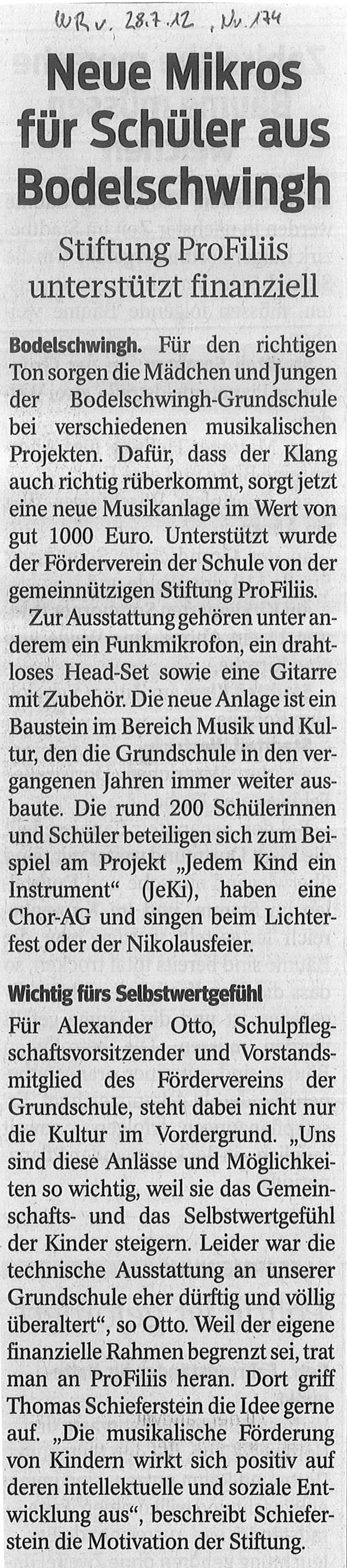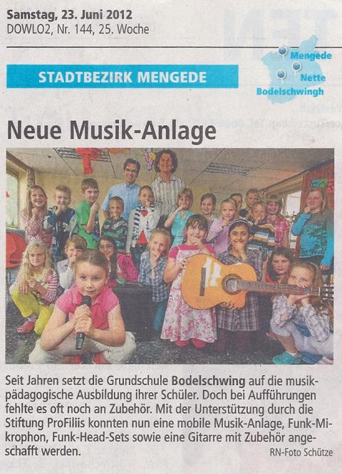 „Uns sind diese Anlässe und Möglichkeiten so wichtig, weil sie das Gemeinschafts- und das Selbstwertgefühl der Kinder steigern. Sie erleben sich als einen Teil der Schulgemeinschaft. Leider war die technische Ausstattung an unserer Grundschule eher dürftig und völlig überaltert, um das Engagement der Kinder und deren guten Ergebnisse im musikalischen Bereich richtig zur Geltung bringen zu können. Da auch bei uns der finanzielle Rahmen begrenzt ist, sind wir an die Stiftung ProFiliis herangetreten und freuen uns daher sehr über deren Unterstützung“, so Alexander Otto, Schulpflegschaftsvorsitzender und Vorstandsmitglied des Fördervereins der Bodelschwingh-GS.